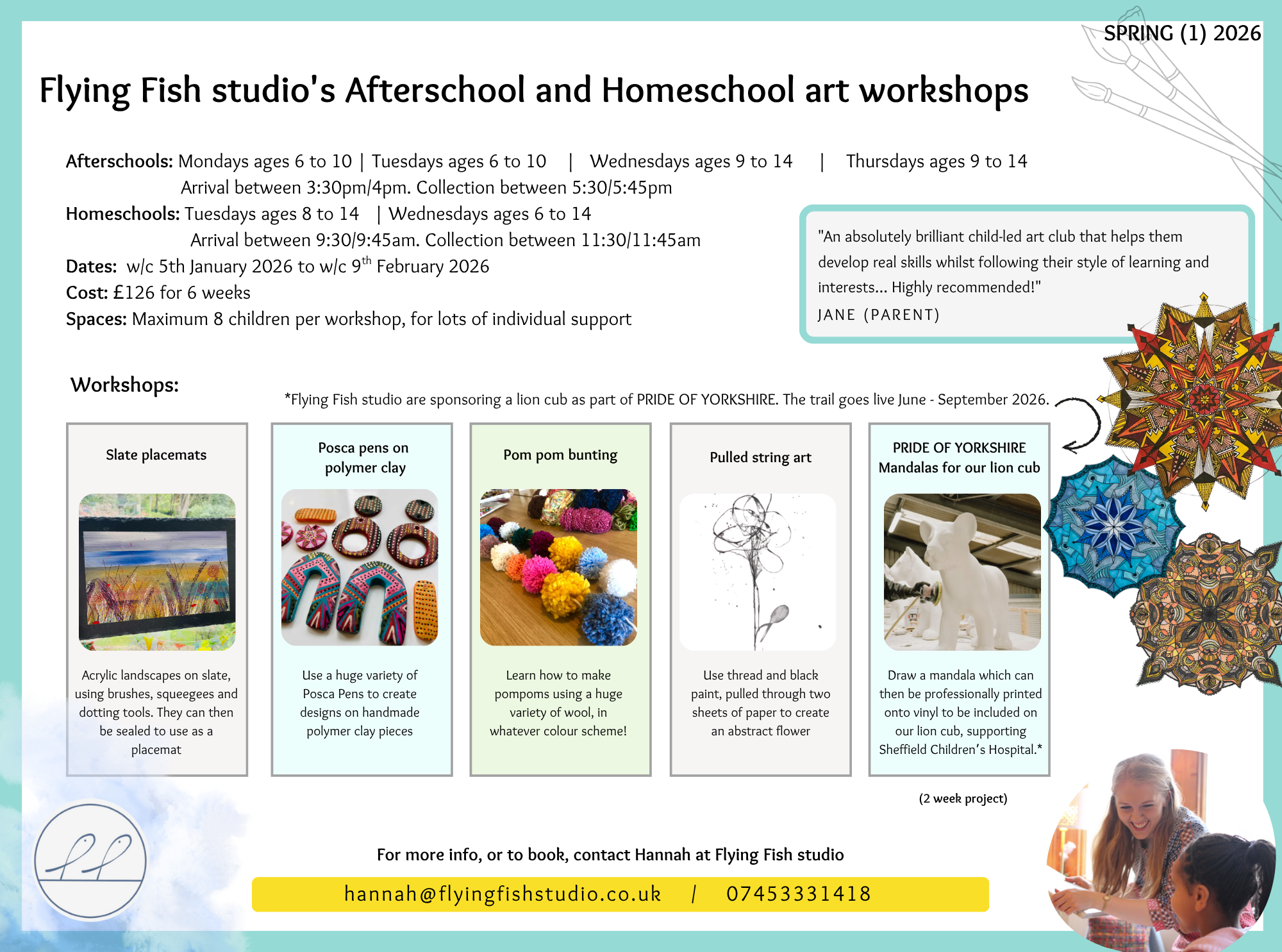 Children can arrive anytime from 3:30pm, but most children arrive later because of their school’s finishing time. We don't tend to start the workshop itself till more like 4pm. It also gives children a chance to relax before we start e.g. have a snack/finish a project from the week before/use their sketchbook/play a game.